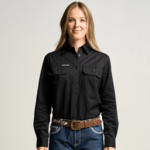 SOMERSET | Womens Half Button Long Sleeve Work Shirt - Black OBCWWS001-BLK